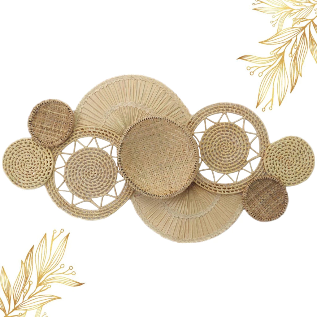 O kit é formado por 3 peneiras de palha , 4 sousplats decorativos e 2 leques de palha de carnaúba , todos feitos à mão. Cada peça possui texturas, tons e tramas exclusivas , tornando sua decoração única e cheia de identidade , ideal para quem valoriza o artesanal.