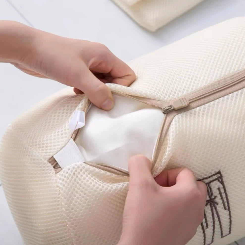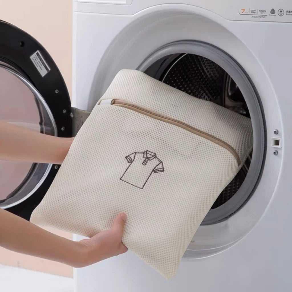 Cada saco é confeccionado com tecido espesso e respirável, permitindo que a água e o sabão circulem livremente sem comprometer a integridade das peças. O fecho com zíper protegido impede que o saco se abra durante a lavagem e protege o tambor da máquina contra riscos.