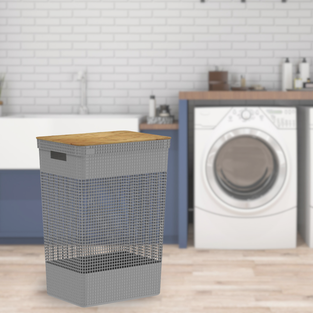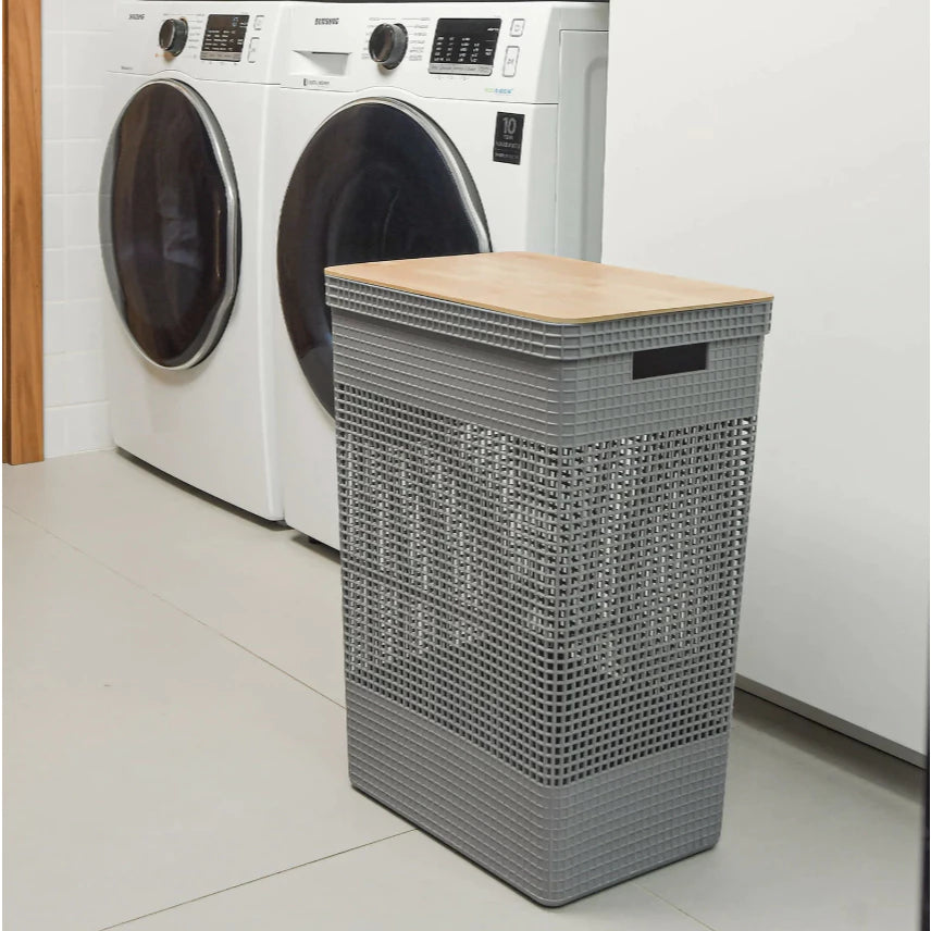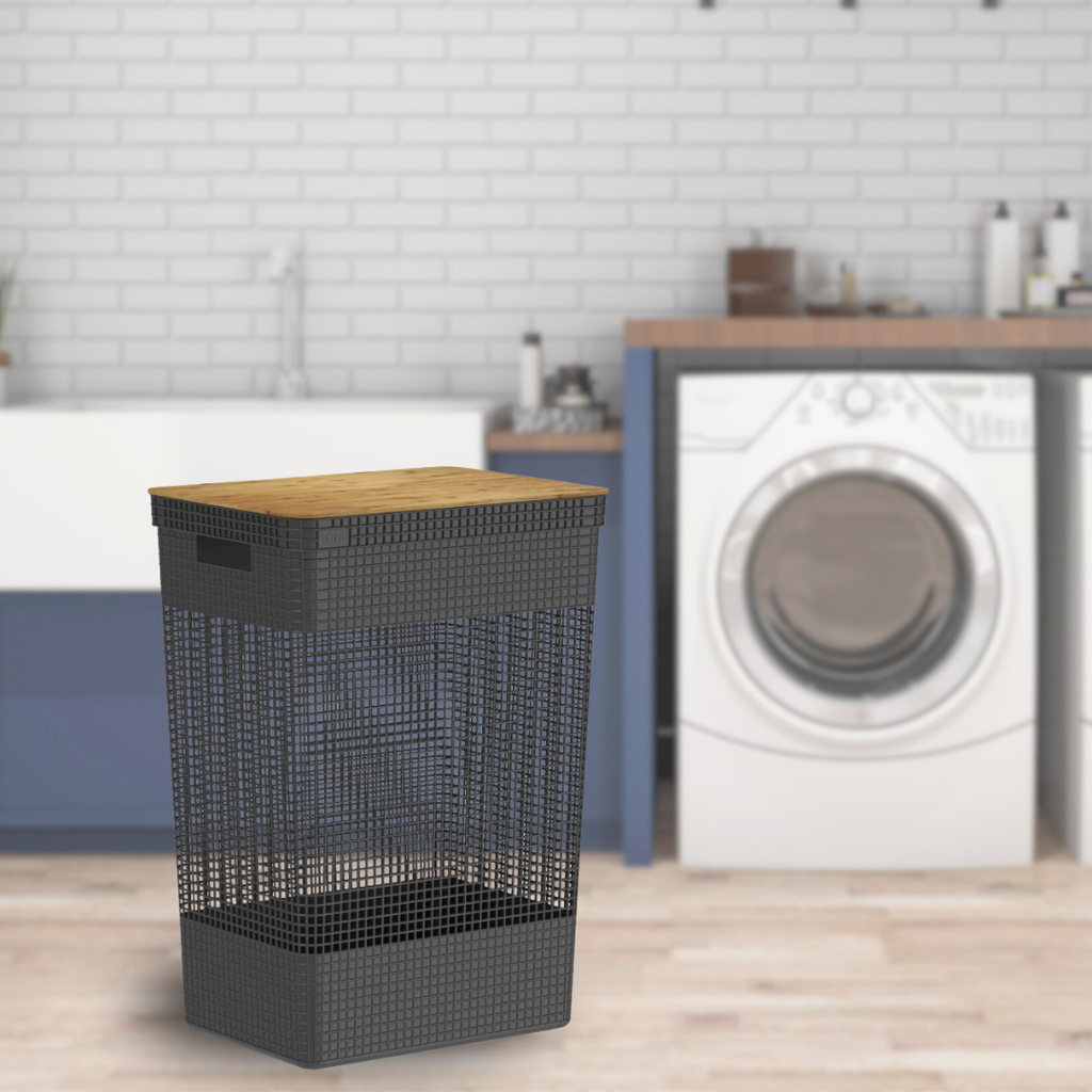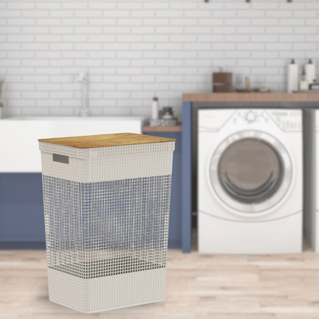 A tampa feita em bambu natural e ecológico não só adiciona charme, mas também mantém a roupa suja fora da vista, contribuindo para um ambiente sempre limpo e organizado. O design grid vazado permite circulação de ar, evitando mofo e mau cheiro.