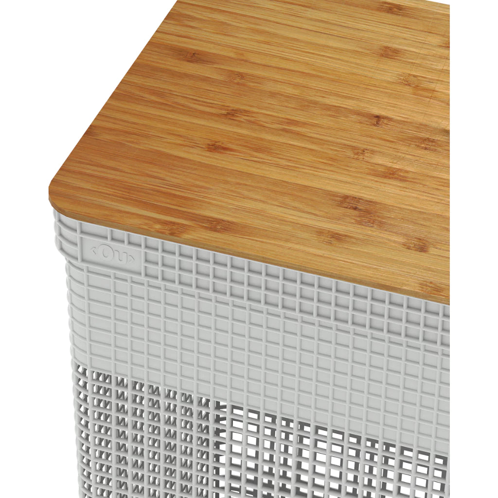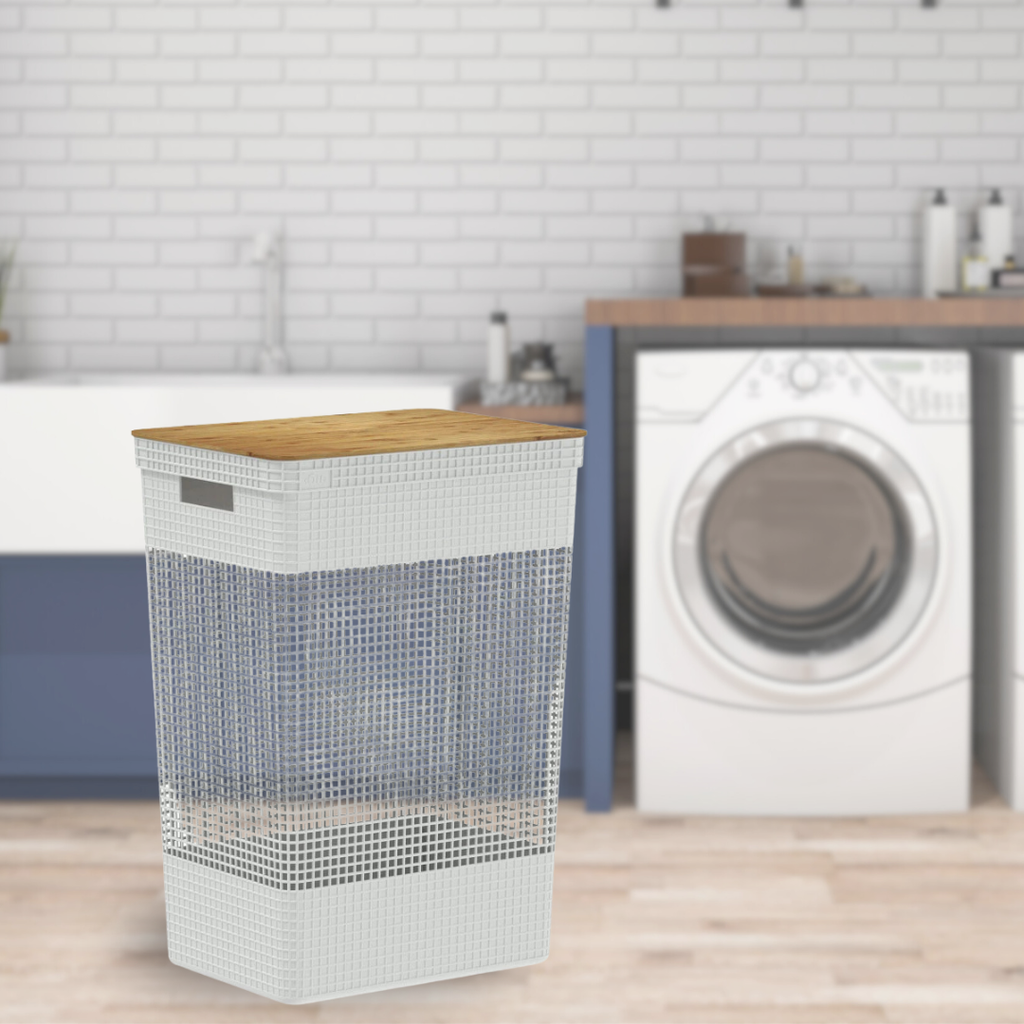 Com 49 litros de capacidade, o cesto comporta uma grande quantidade de roupas, toalhas e lençóis. Sua estrutura rígida e leve garante estabilidade, enquanto o acabamento em bambu natural na tampa traz um toque de sofisticação e protege contra odores e umidade.