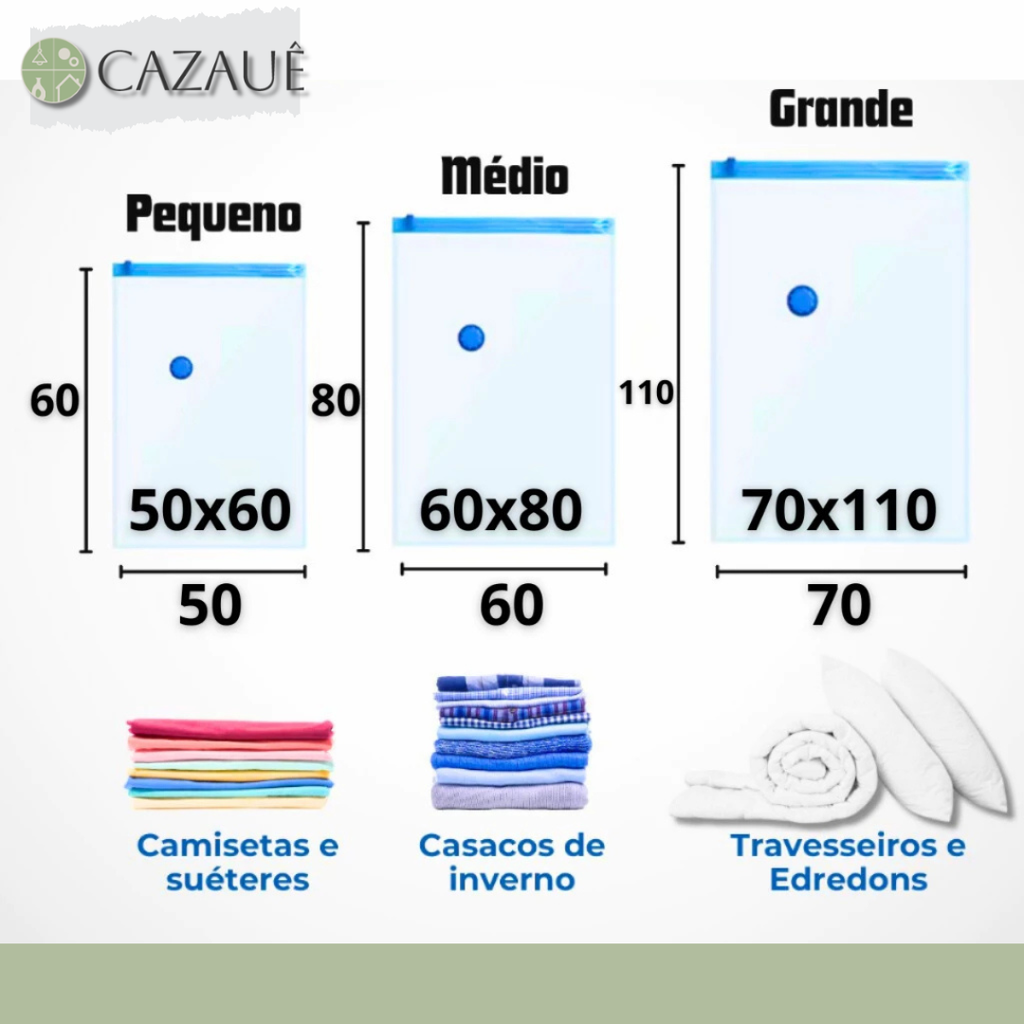 5 - Sacos a Vácuo Premium – perfeitos para roupas, toalhas e edredons médios, nas medidas (em CM): 50x60 ou 60x80 ou 70x110