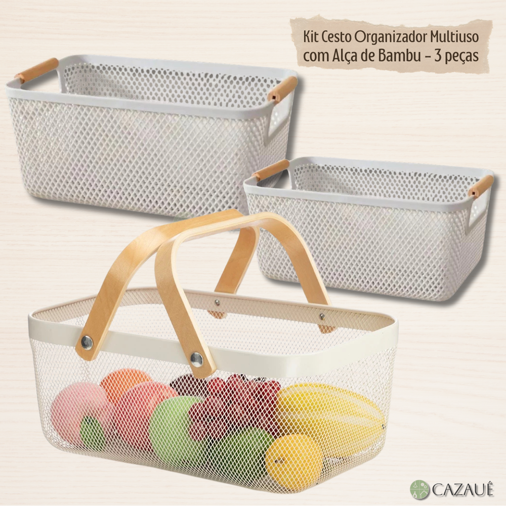 Kit Cesto Organizador Multiuso com Alça de Bambu - 3 peças
