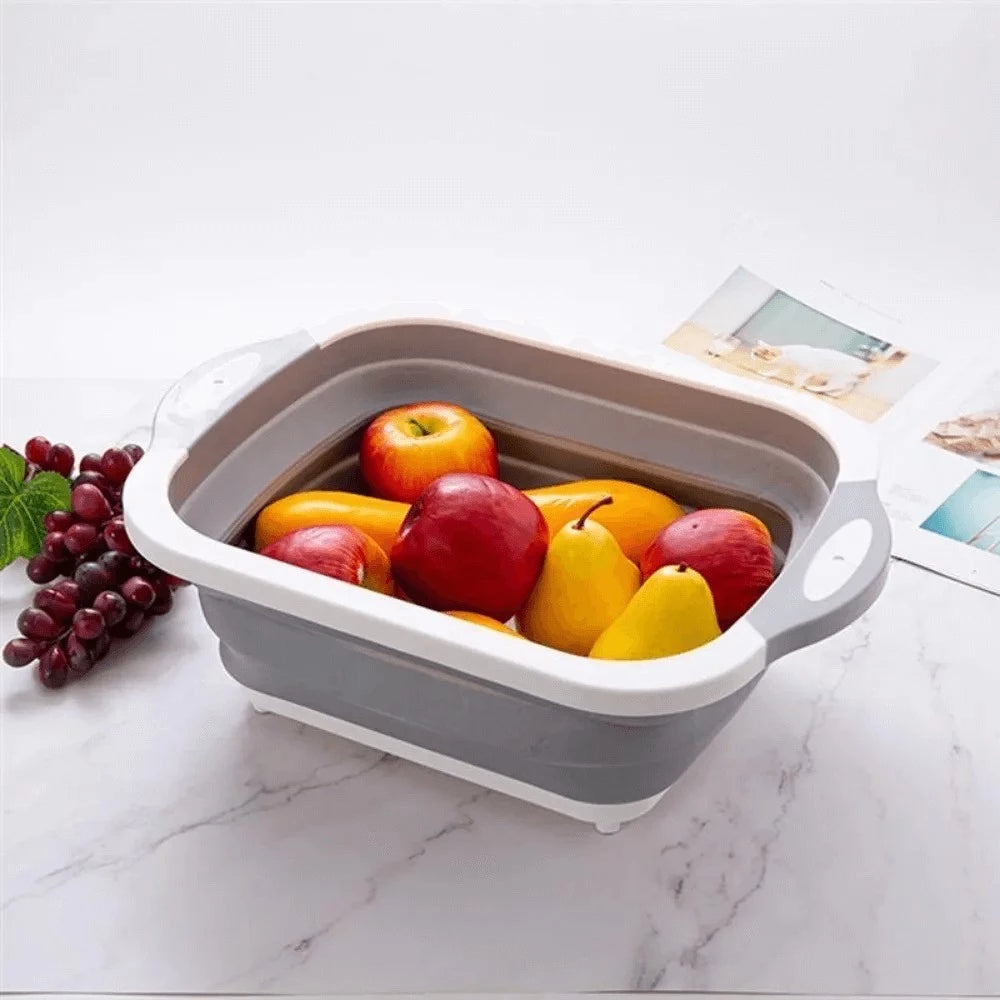 Escorredor e Tábua Cesta Dobrável 3 em 1 – Silicone Retrátil Multifuncional para Cozinha